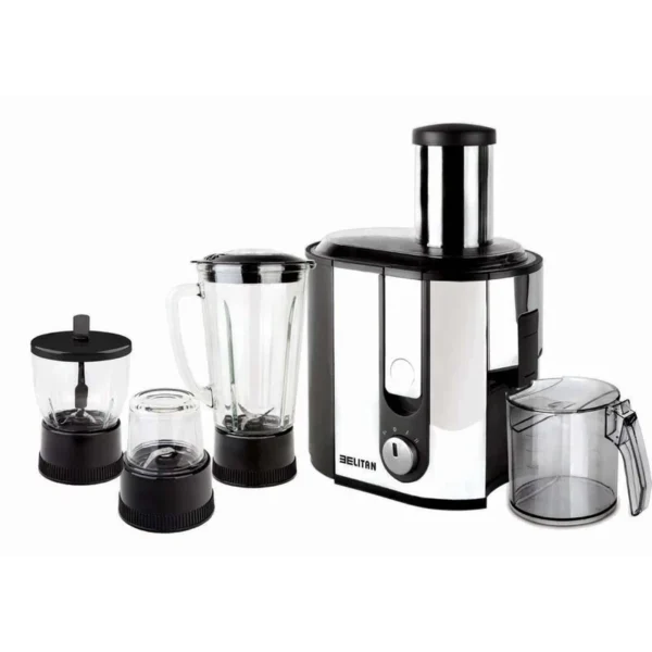 آبمیوه گیری ۴کاره بلیتان مدل BT-۳۱۶۳ اطلاعات فنی قدرت ۴۰۰وات توان قفل ۱۰۰۰ وات مخزن تفاله آبمیوهگیری قابلیت ورود یک سیب کامل در آبمیوهگیری دو سرعته , مجهز به روشن شدن لحظه ای دارای تیغه و توری تمام استیل جنس بدنه از استیل ضدخش دارای خرد کن , آسیاب , پاچ شیشه ای مخلوط کن