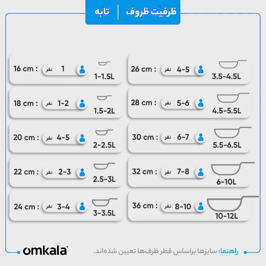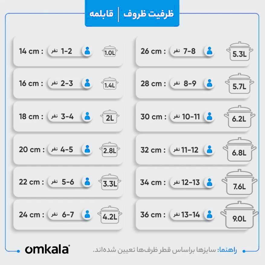 سرویس قابلمه و تابه 12 پارچه کرکماز در ابعاد مختلفی از 16×10 cm (2.0 L) تا 36×17 cm (17.3 L) عرضه می شود. این تنوع باعث می شود شما بتوانید بسته به نیاز، قابلمه یا تابه مناسب را انتخاب کنید.