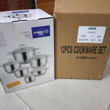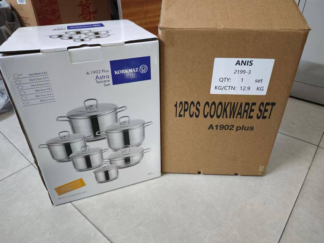 مشخصات سرویس پخت و پز Korkmaz A-1902 Plus Astra مدل: A-1902 Plus Astra برند: KORKMAZ تعداد پارچه: 10 PCS (10 پارچه) جنس: 18/10 Cr‑Ni Stainless Steel (فولاد ضد زنگ کروم‑نیکل ۱۸/۱۰) سایز و ظرفیت قابلمه ها (قطر × ارتفاع | ظرفیت): 16 × 10 cm (2.0 L) 20 × 12.5 cm (3.9 L) 24 × 14.5 cm (6.5 L) 28 × 16 cm (9.8 L) 32 × 17 cm (13.6 L) 36 × 17 cm (17.3 L) همچنین در سمت راست جعبه قهوه ای رنگ، مشخصات کلی ست تحت عنوان “12PCS COOKWARE SET” (سرویس پخت و پز ۱۲ پارچه) با مدل A1902 plus نوشته شده است. مشخصات ست ANIS (روی جعبه قهوه ای): مدل/کد: ANIS 2199-3 تعداد (QTY): 1 set وزن ناخالص (KG/CTN): 12.9 KG