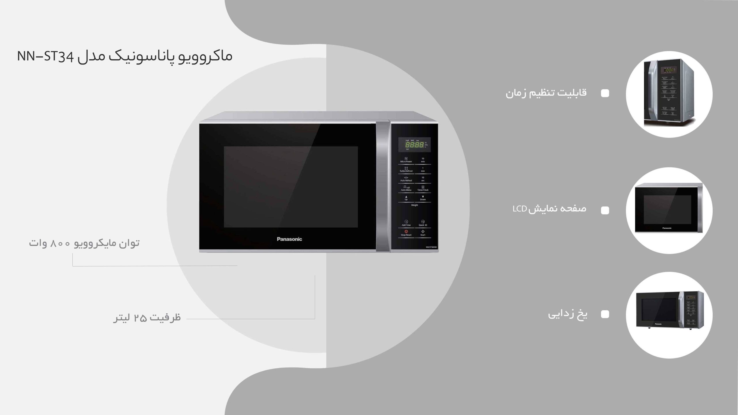 از اولین نگاهی که به ماکروویو پاناسونیک NN-ST34 می اندازید، می توانید حس کیفیت و دقت مهندسی را در آن حس کنید. برند PANASONIC با سال ها تجربه در زمینه لوازم خانگی، این مدل را با تمرکز بر کارایی، ایمنی و راحتی کاربر طراحی کرده است. توان مصرفی 800 وات، ظرفیت 25 لیتر و صفحه نمایش LCD، فقط بخشی از ویژگی های برجسته این دستگاه هستند.